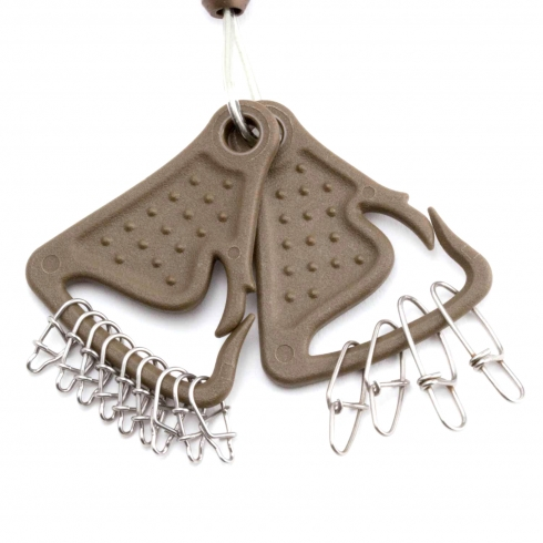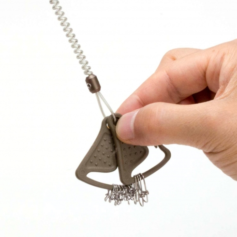 The D-shaped carabiner incorporating a 45-cm-long rope that can be mounted to game vests with ease.