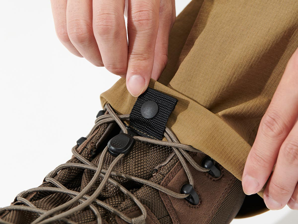 The hem has a loop that can be connected to shoes to reduce the intrusion of grass and sand into the shoes.