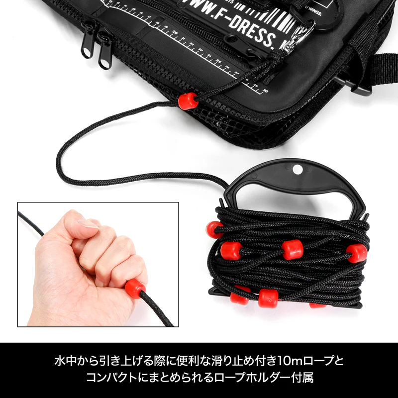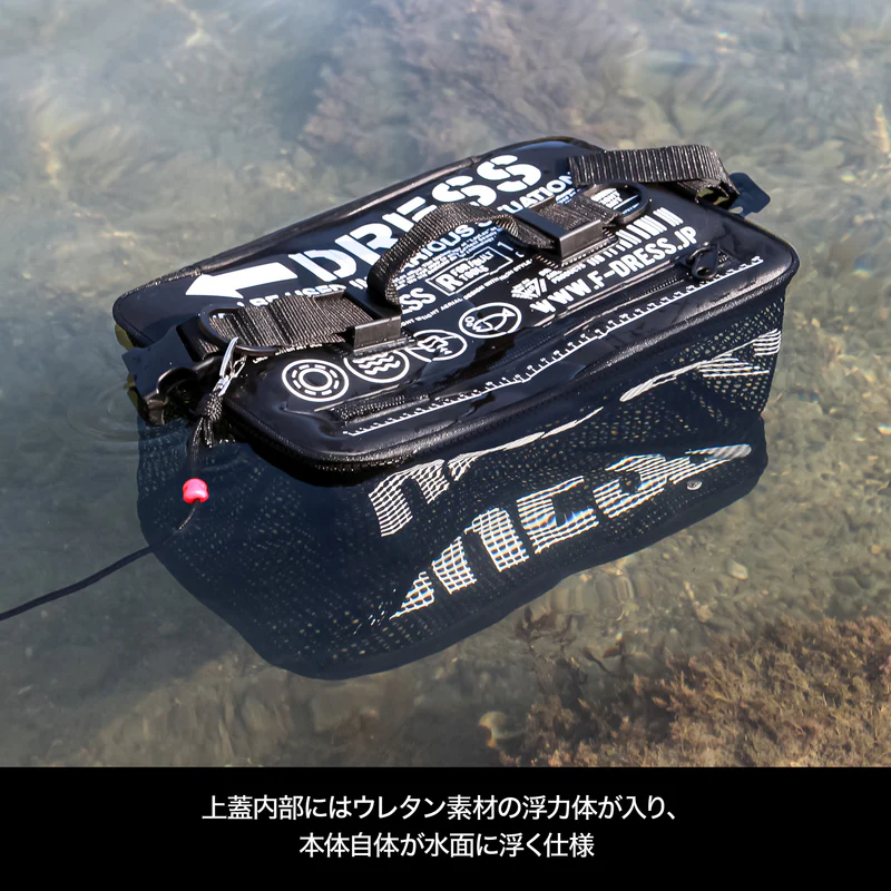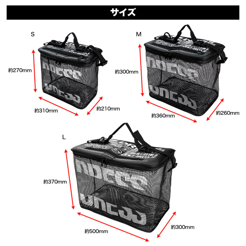 This is a net-shaped container for keeping caught fish alive underwater. The lid is made of urethane material, so it can be used floating on water. The handle has a standard D-ring, making it easy to attach a cord. The side zipper is a mega zipper type that makes it easy to put things in and take them out, and a simple measuring tape is located on the top lid. If you fold it in half with the urethane mesh side facing inward and fasten the belt buckle, it becomes compact and doesn't take up much space even when you're running around in the gun style.
