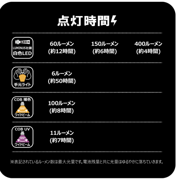 ●The 6 lumen warm light illuminates only the area around your hands, making it convenient for changing lures, etc.