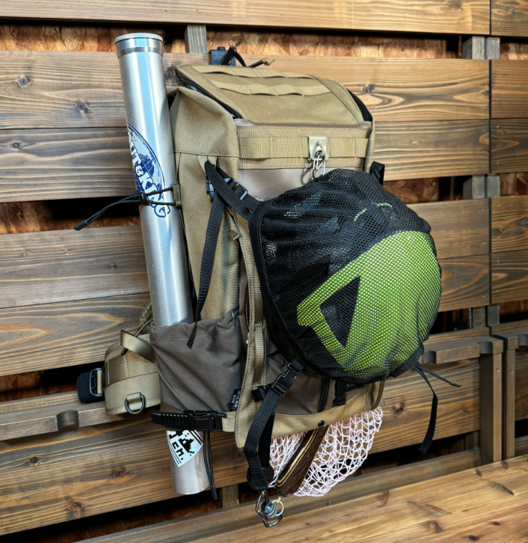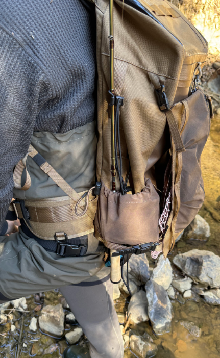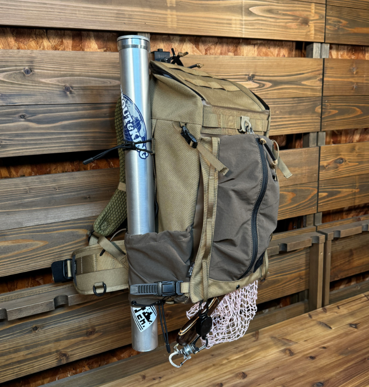 One side pocket (left side) is designed with a through hole to hold a rod case for spare tackle in place (secured with a bungee cord).