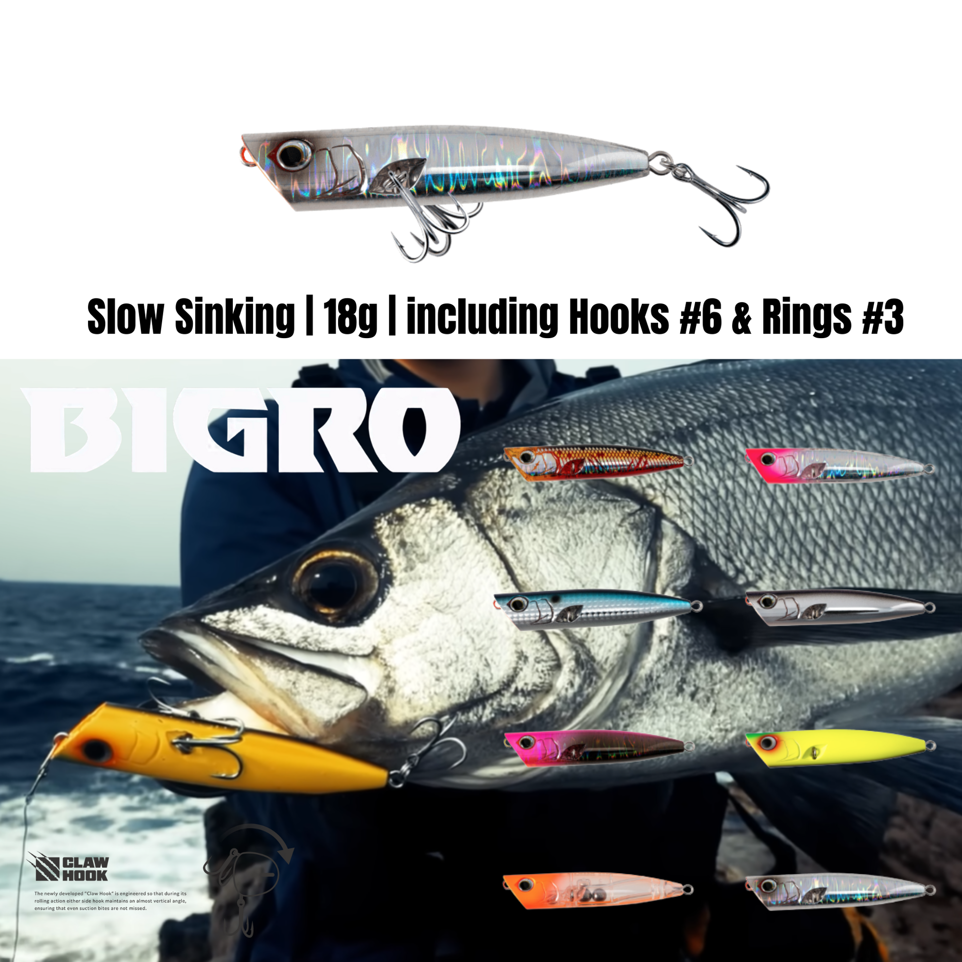 On a surface whipped by waves and whitewash, the lure is pushed aside and hooks have trouble finding the fish’s mouth, easily leading to missed strikes. In pursuit of better hooking performance, we overturned the “belly-mounted hook” convention and arrived at the “Claw Hook,” which places hooks on both side flanks.