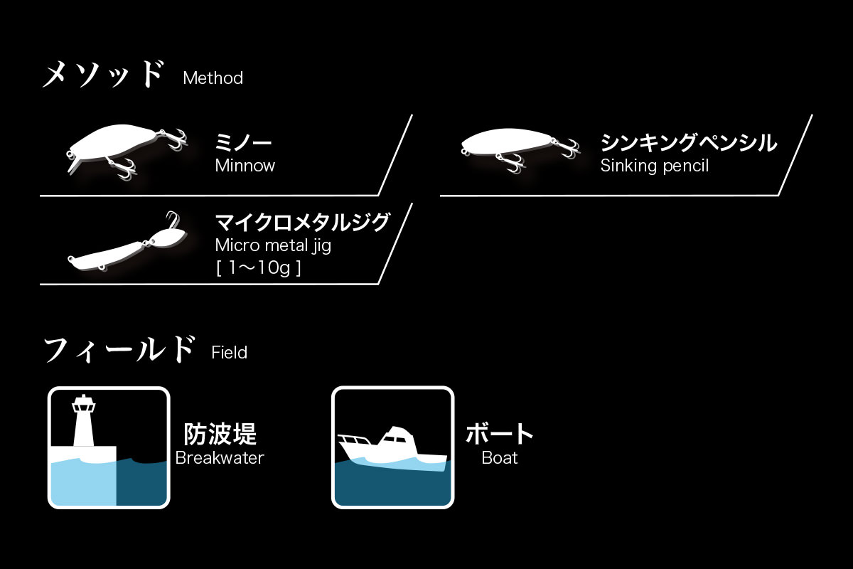 If you're attacking rockfish with hard bait, look no further than this rod. When used with small minnow lures or sinking pencils, it allows for repeated casts over a wide area, the ultimate in pleasant browsing. Thanks to the signature Shoreluck graphite shaft , which throws any kind of lure or rig much farther than the rest, this rod demonstrates a baffling long-distance cast ability. The special layered design of the latest 7'2” model feels firm in the hand, sending a clear plug action response down to your toes even when fishing from points high above the water. Engineered so that even the most delicate bites register as “metallic,” the peculiar tension of the extra fine tip lends acute sensitivity and responsiveness to your attacks. Unlike old-fashioned rods that only bend at the tip, the SL-72LS has an adaptive shaft that loads deeply during rigorous retrieves, thoroughly minimizing last-second losses at the surface. This rod easily contends not only with the fierce tugs of jumbo rockfish, but the sudden jerks of juvenile Japanese sea perch and blackhead seabream.