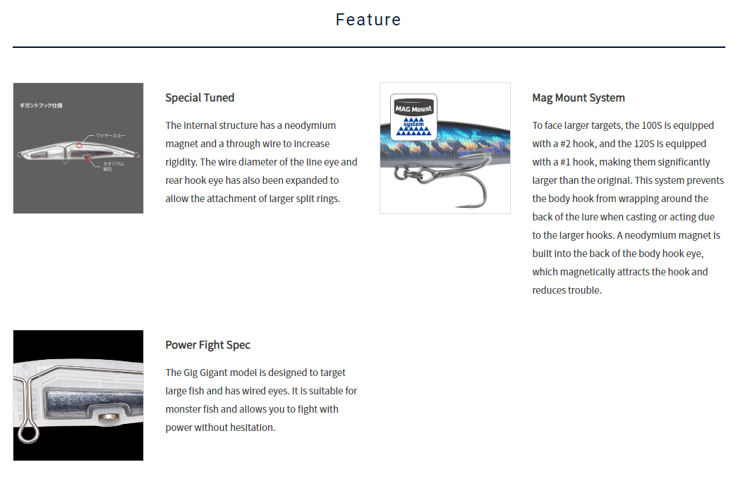 Gig Gigant Hook is designed for large fish. It is an offshore model with a larger hook size while keeping the minnow-like silhouette. It is equipped with a treble hook that is significantly larger than the original. With the unusually large hook, it is equipped with a Mag Mount System to prevent the belly hook from getting caught on the back of the lure. This keeps the hook attached to the belly by magnetic force, reducing trouble. Furthermore, the wire-through is used to increase strength, allowing for a safe fight without compromising the casting distance or action. Take on larger targets with the Gig Gigant Hook.