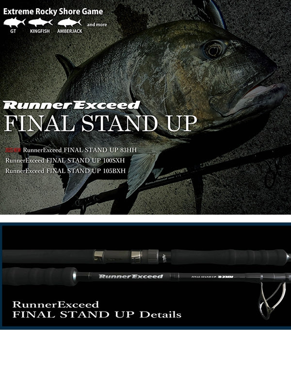 In the countless fields out there around the world, there are places where astonishing size species exist and it is beyond human knowledge. It is impossible to target large GT, Dogtooth, Amberjacks, Kingfish, Yellowtail Tuna, etc from the rocks or piers with ordinary tackle. The “Runner Exceed Final Stand Up” series are highly well balanced rods equipped with outstanding castability, a smooth bending curve with exceptional power, and rod taper design that allows anglers to lift the rod tip during brutal fights against the monstrous targets by your feet.