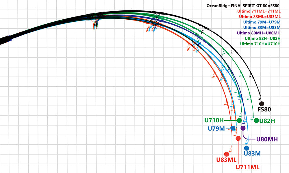 Comparison between the Ultimo and OceanRidge with a still weight of 6kg. For reference, we have also compared the BIG TUNA 710JAPAN SP and Aquila 85H Nano Extreme. We have compared the bend curve of our GT series of Ultimo and the OceanRidge series with a still weight of 6kg. As there are many overlaying each other, we have displayed the Ultimo series in different color depending on power and the OceanRidge series depending on model. We have also displayed the BIG TUNA 710 and Aquila 85H with the same weight in gray for reference.