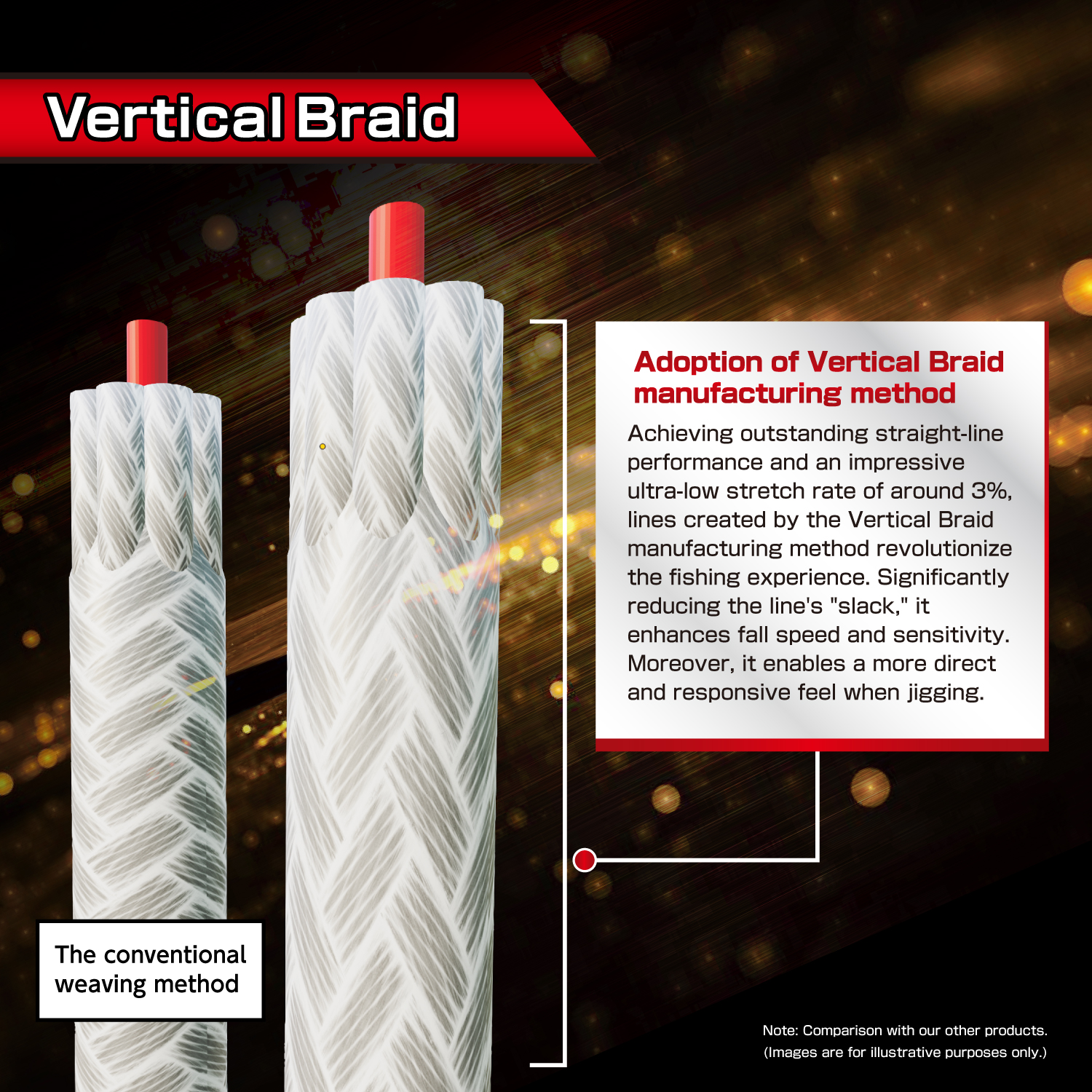 Achieving outstanding straight-line performance and an impressive ultra-low stretch rate of around 3%, lines created by the Vertical Braid manufacturing method revolutionize the fishing experience. Significantly reducing the line's "slack," it enhances fall speed and sensitivity. Moreover, it enables a more direct and responsive feel when jigging.